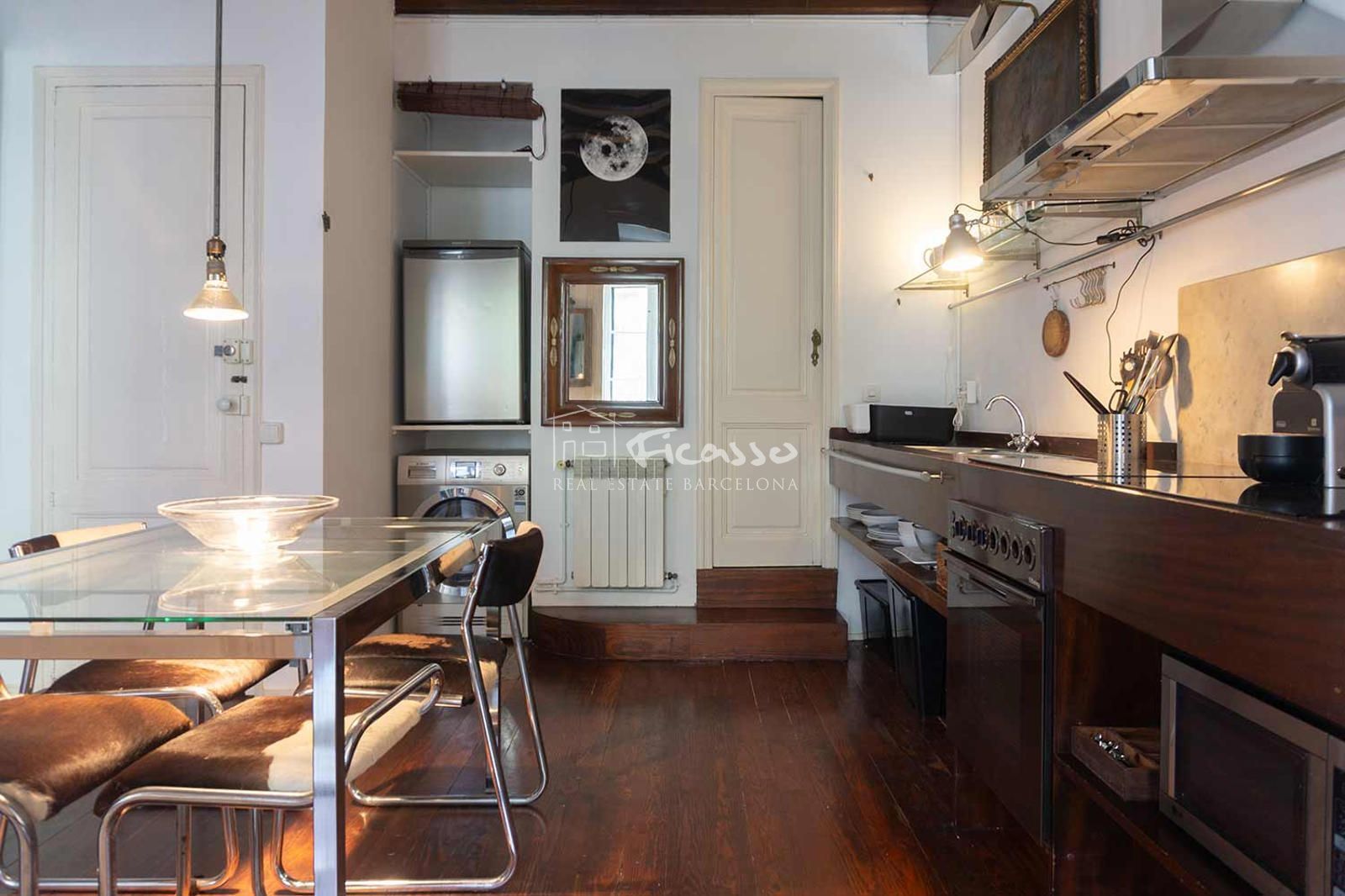 Acceso en la zona de comedor, amueblada con mesa para cuatro comensales, estanterías y con cocina abierta. Está equipada con lavadora/secadora, placa de inducción, nevera pequeña, horno y microondas, así como con menaje de cocina. La zona de salón tiene dos ventanas dobles que abren a la calle Valencia con un balcón francés. Esta zona dispone de un sofá-cama, mesa de centro, silla y una cama doble. Baño independiente completo, con ducha.